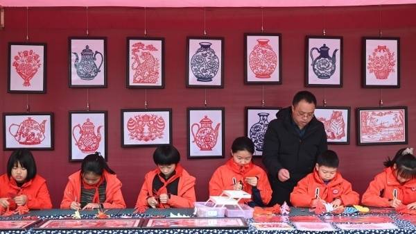 菜市街小学学生正在安分的开辟下剪纸。李波摄